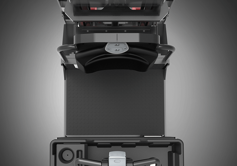 Cushioned backrest, floor mat, and knee pad enhance operator comfort for greater productivity.